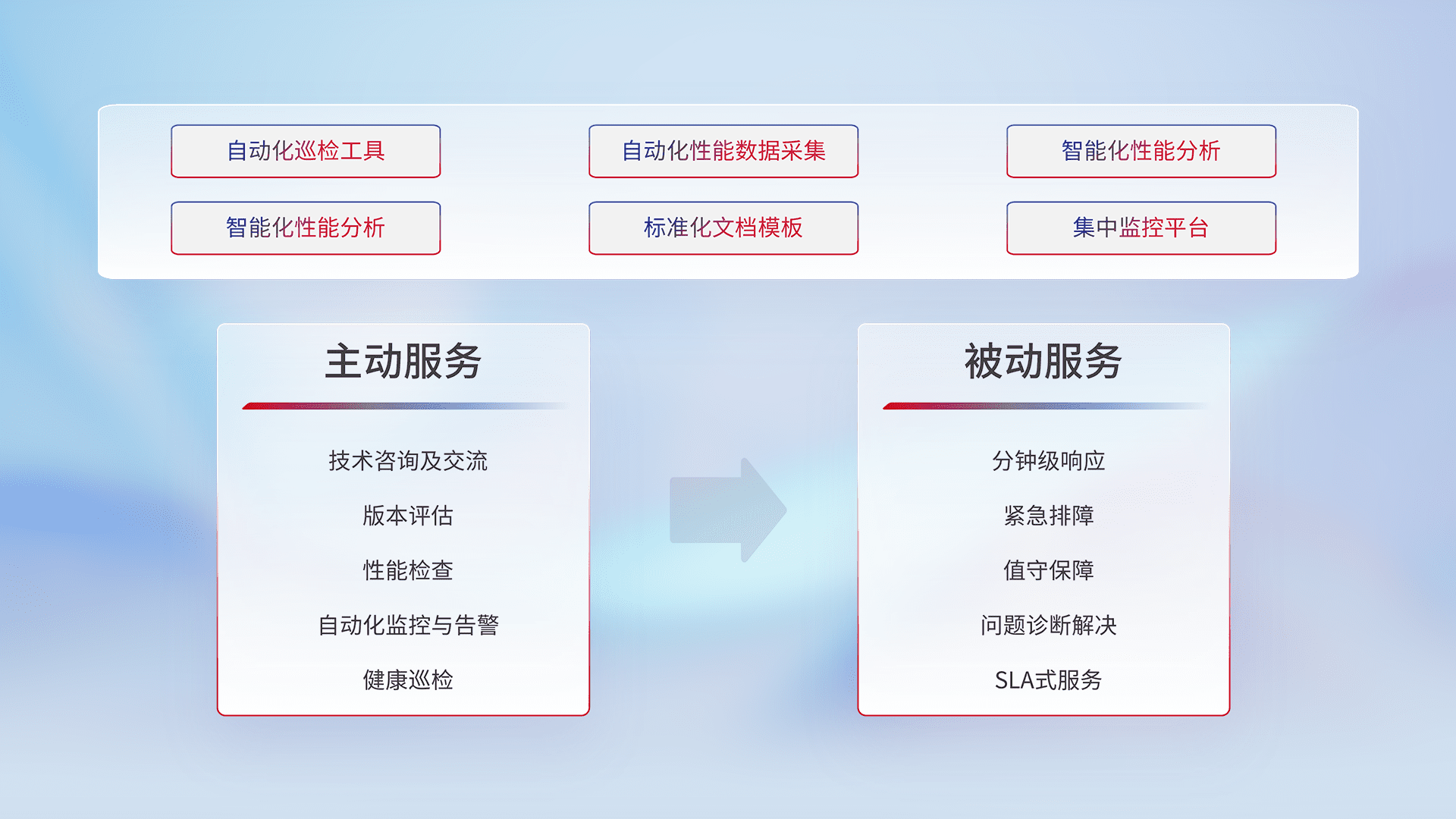 智能化工具和标准化文档,,,保障服务质量,,,,提供主动服务(包含技术咨询、、版本评估、、、性能检查、、、、自动化监控与告警、、健康巡检)和被动服务包含(分钟级响应、、、、紧急排障、、值守保障、、、、问题诊断解决、、SLA服务)。。。。
